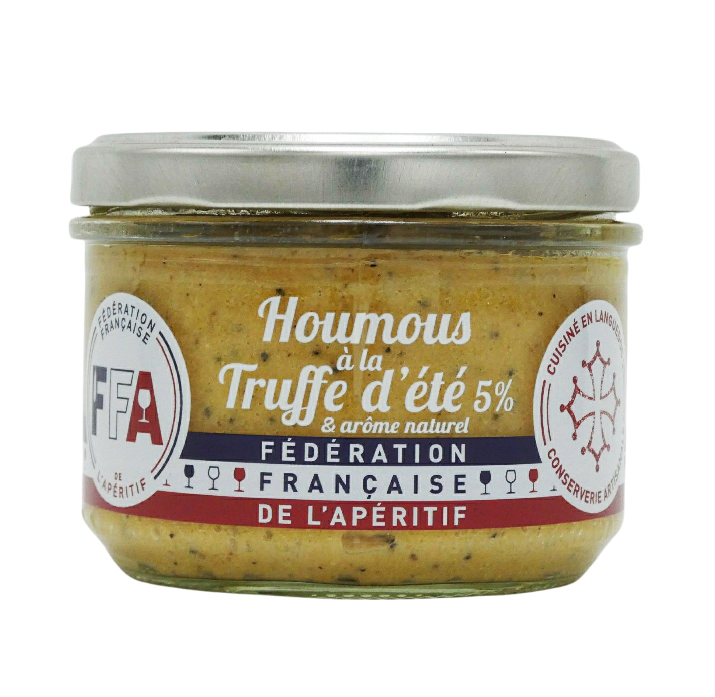 Ingrédients: Pois chiche (44%), oignon, huile d’olive, jus de citron, huile de colza, truffe d’été (tuber aestivum, 5%), eau, sel, arôme naturel (0,2%), poivre noir. Traces possibles de fruits à coque, arachides, céleri, moutarde, graines de sésame.